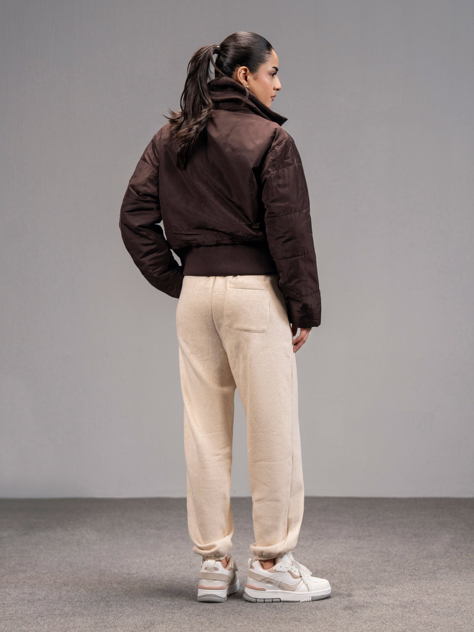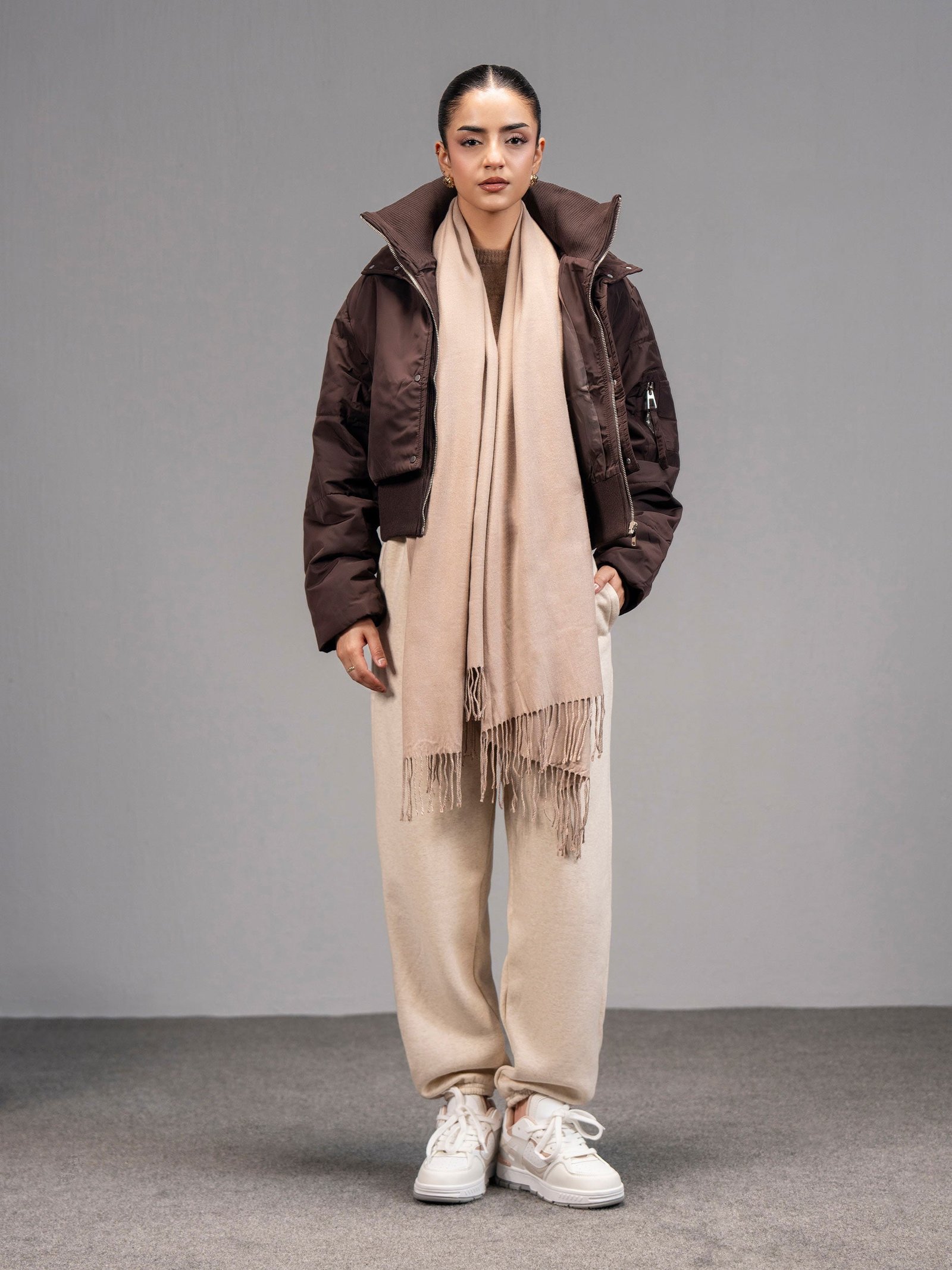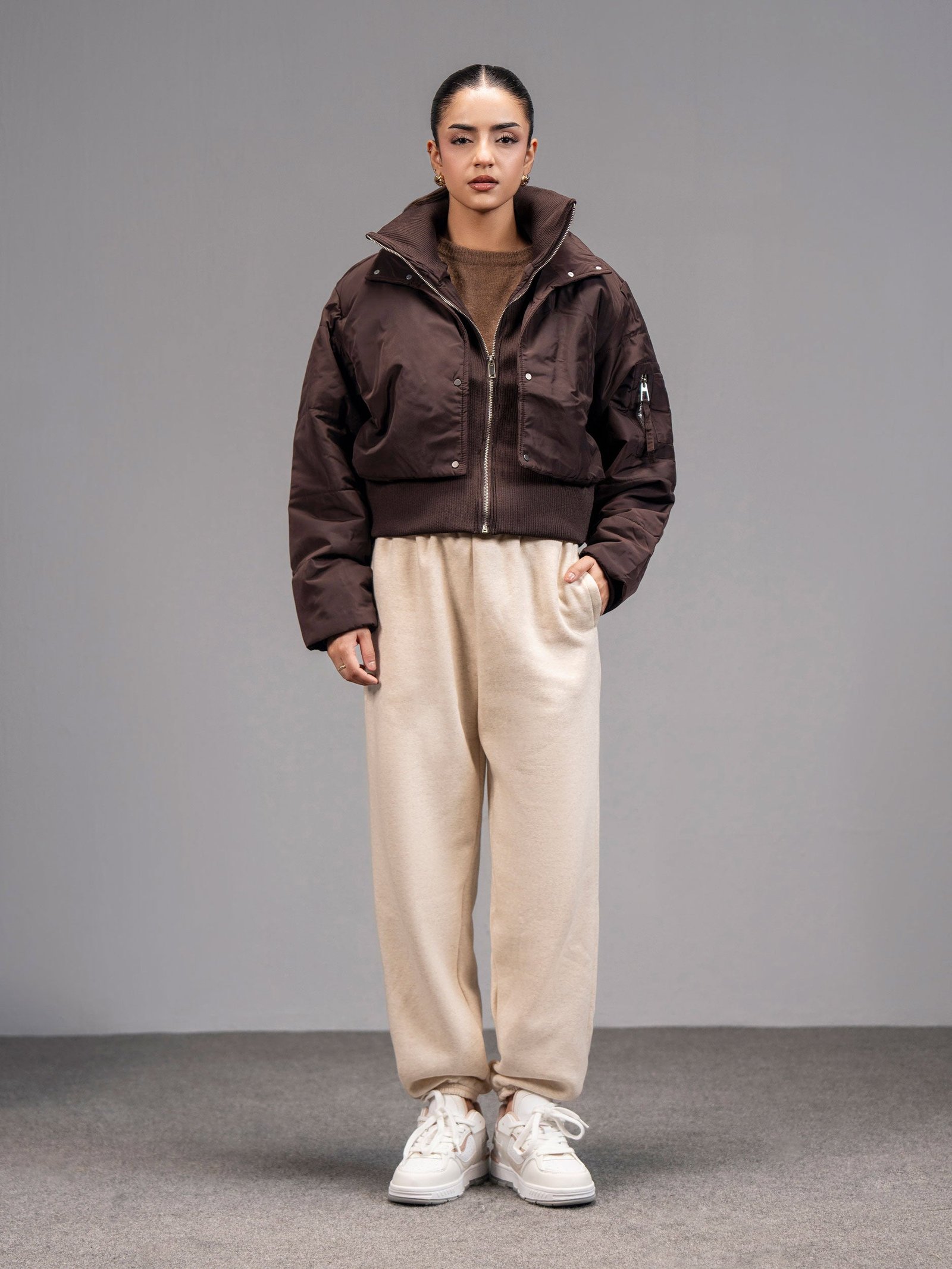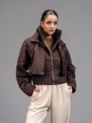 • Cropped jacket with a high collar. zip closure. knitted inner layer. and side