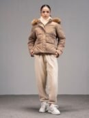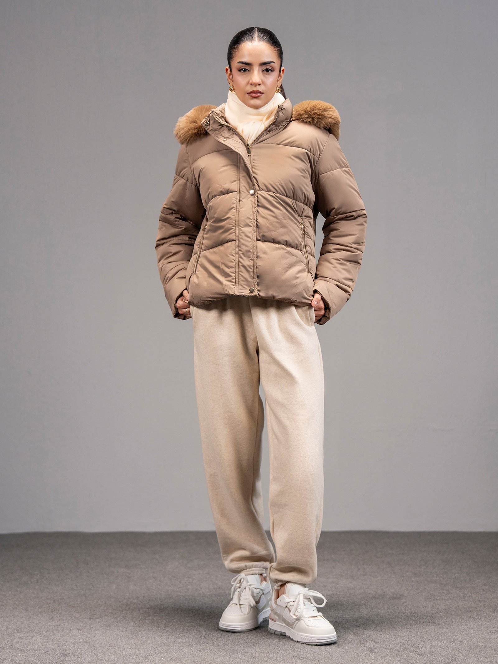 • Puffer jacket with side pockets. a zip closure. and a detachable fur hood